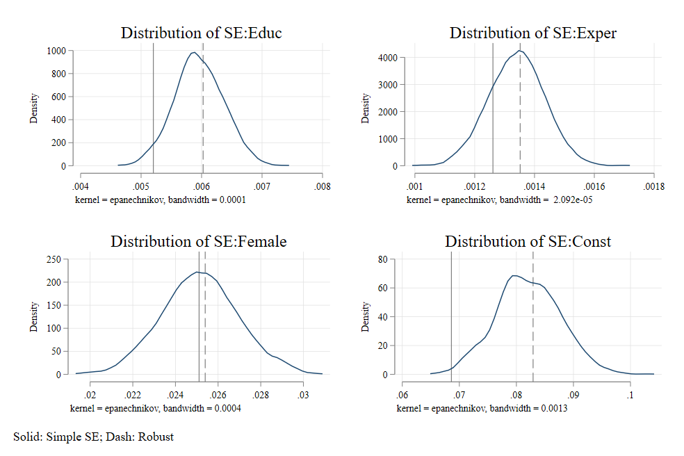 frause oaxaca, cleargen tchild = kids6 + kids714captureprogramdrop bs_wages_childrenprogram bs_wages_children, eclass// eclass is for things like equations ** Estimate first modelreg lnwage educ exper femalematrix b1 = e(b)matrixcoleq b1 = lnwage ** Estimate second modelreg tchild educ exper femalematrix b2 = e(b)matrixcoleq b2 = tchild ** Put things together and postmatrix b = b1 , b2ereturnpost bendbootstrap: bs_wages_children