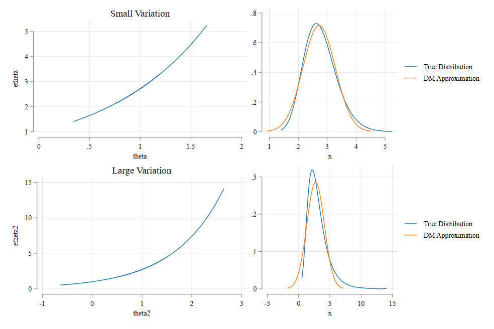 Say that you estimated \(\theta \sim N(\mu_\theta, \sigma^2_\theta)\) but are interested in the distribution of \(g(\theta)\). How do you do this?