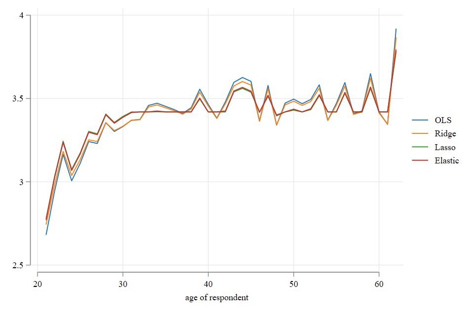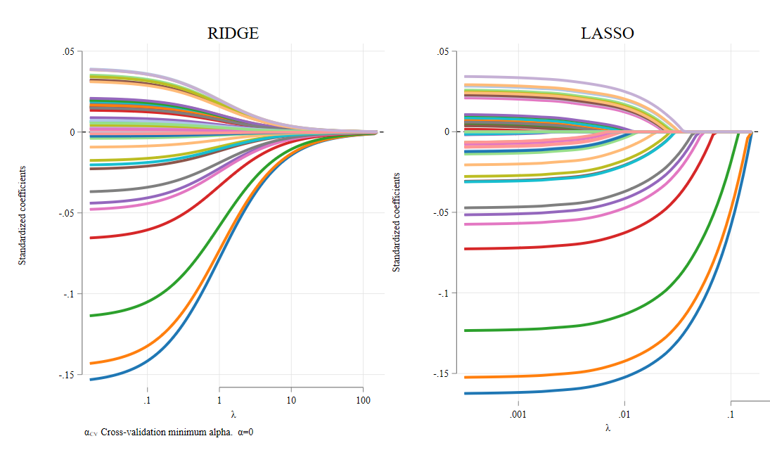 setlinesize 255frause oaxaca, clearkeepif lnwage!=.gen male = 1-femalemata:y = st_data(.,"lnwage") x = st_data(.,"educ exper female male")// Standardization. Need men and SD mn_x = mean(x) sd_x = diagonal(sqrt(variance(x)))'// Centering and addinc constant x = (x:-mn_x):/sd_x; x = x,J(1434,1,1) i0 = I(5);i0[5,5]=0// SD errors as Column, including a 1 for Constant sd_x=sd_x'\1 xx = (cross(x,x)) ; xy = (cross(x,y)) bb0 = invsym(xx)*xy bb1 = invsym(xx:+i0*1)*xy bb10 = invsym(xx:+i0*10)*xy bb100 = invsym(xx:+i0*100)*xy bb1000 = invsym(xx:+i0*1000)*xy bb10000 = invsym(xx:+i0*10000)*xy bb100000 = invsym(xx:+i0*100000)*xy// bb0:/sd_x,bb1:/sd_x,bb10:/sd_x,bb100:/sd_x,bb1000:/sd_x,bb10000:/sd_x, bb100000:/sd_xend