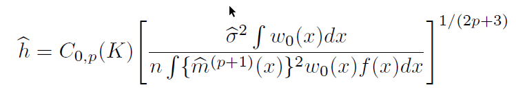 \[ h = 1.059 \sigma n ^ {-1/5} \\ h = 1.3643 * d * n ^ {-1/5} * min(\sigma,iqr\sigma) \]