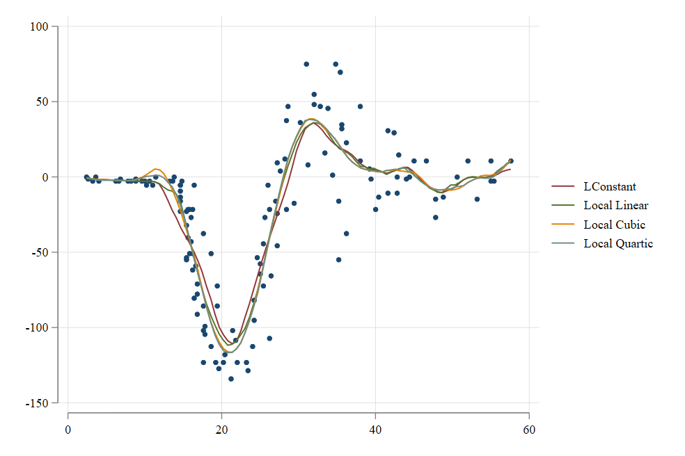 ------------------------------------------------------------------------------Full non-parametric estimations are powerful to identify very flexible functional forms. To avoid overfitting, however, one must choose tuning parameters appropriately (\(h\) and \(cutoffs\) ).