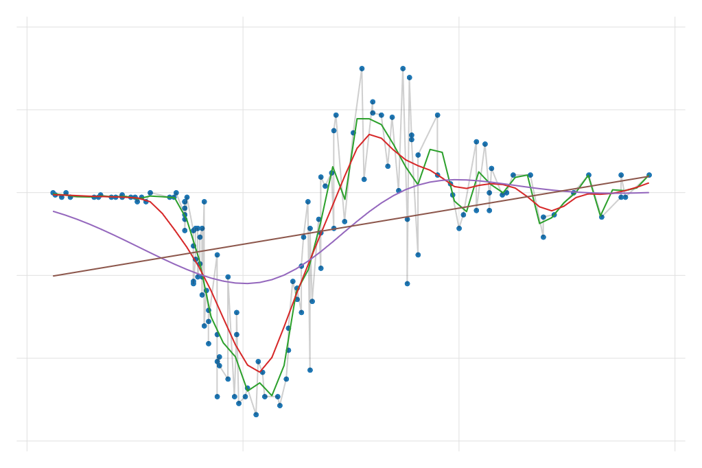 Which, on its core, is simply a weighted regression, with weights given by \(\frac{K_w(x_i,x)}{\sum K_w(x_i,x)}\)