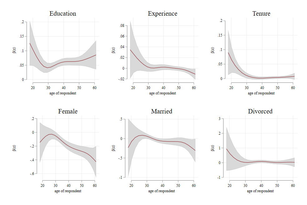 vc_reg lnwage educ exper tenure female married divorced, vcoeff(age) k(20)