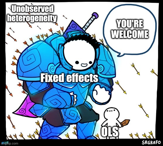 \[ y_{it} = \delta D_{it} +X_{it} \beta + Z_{it} \gamma + e_{it} \]