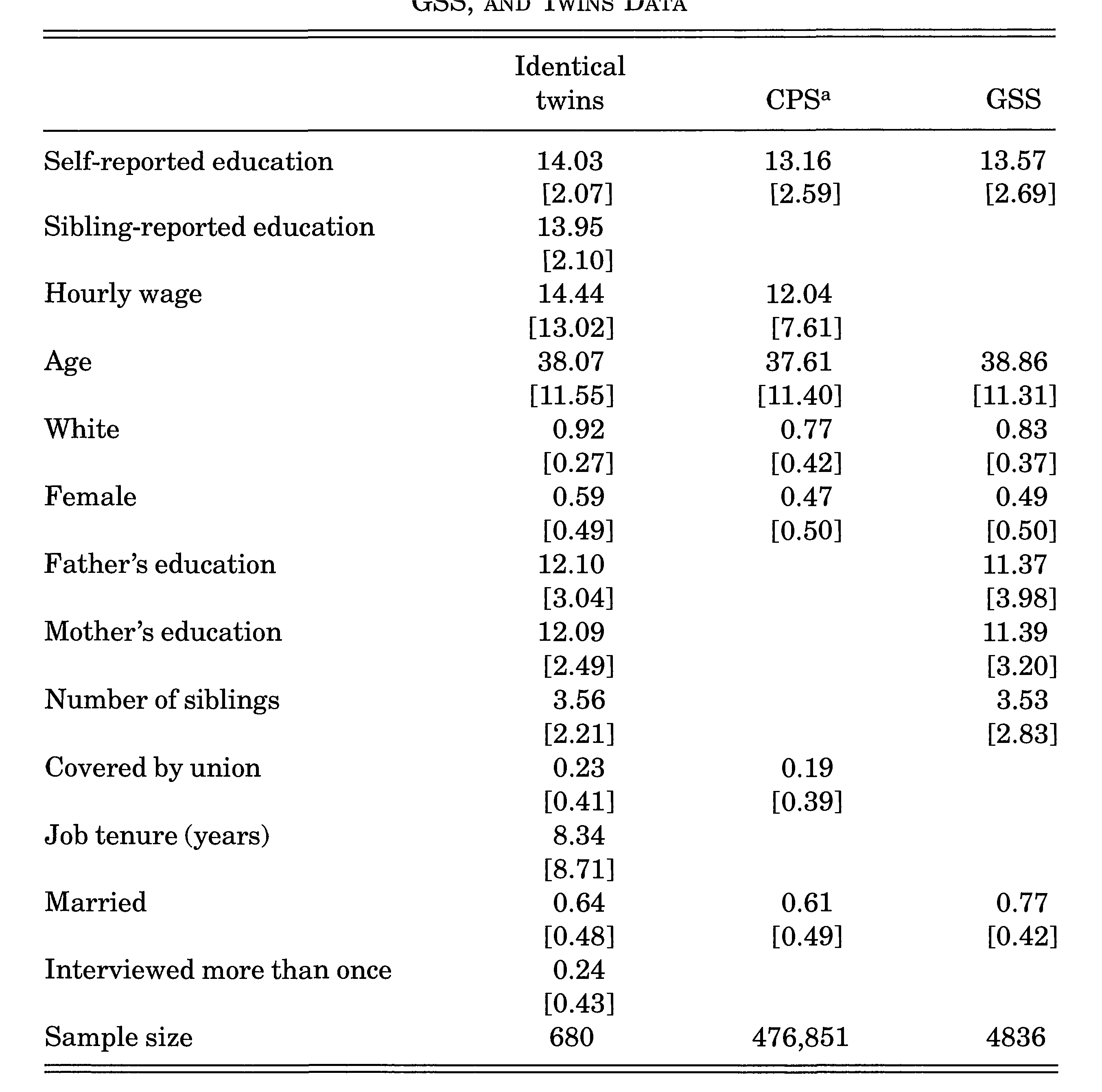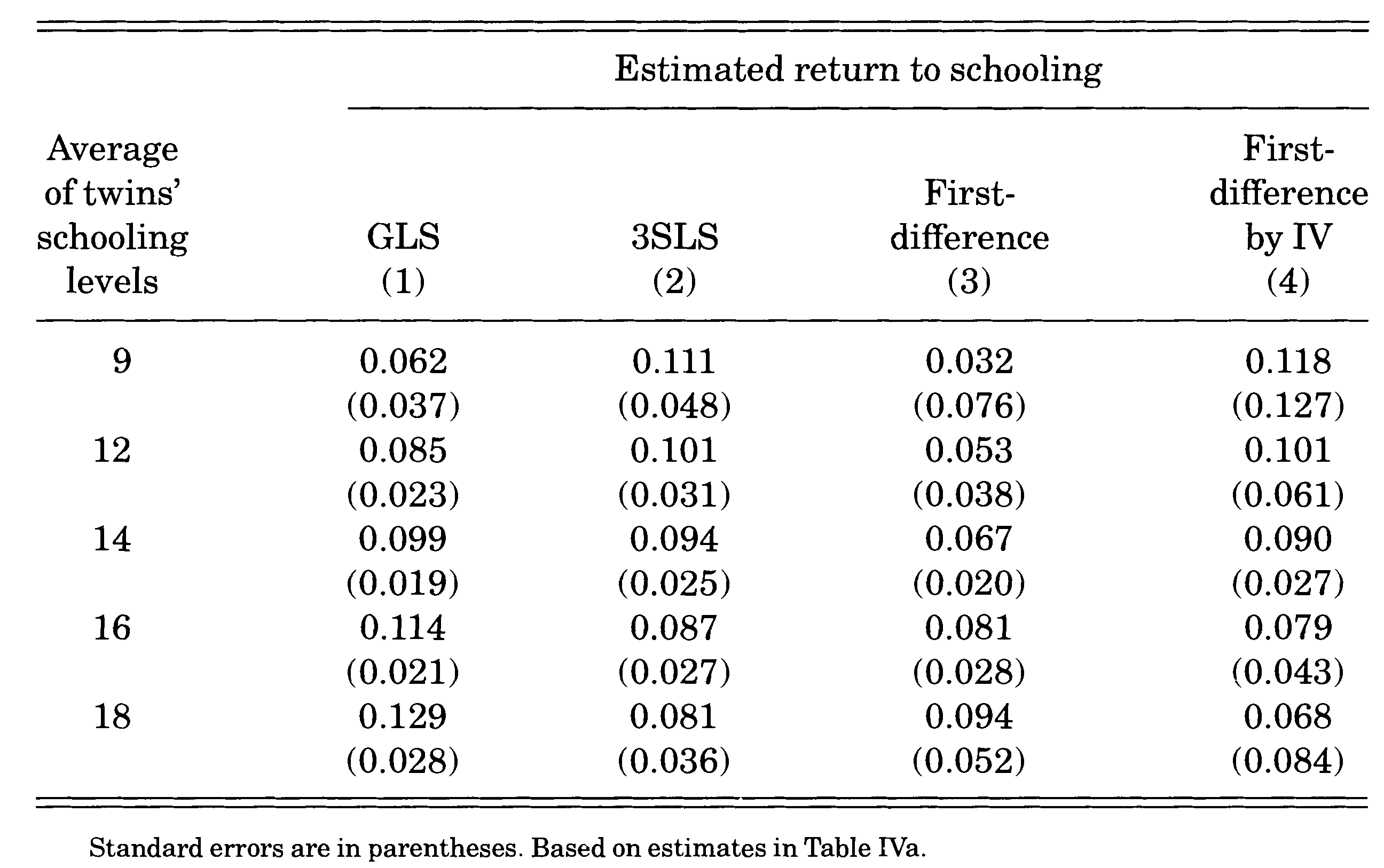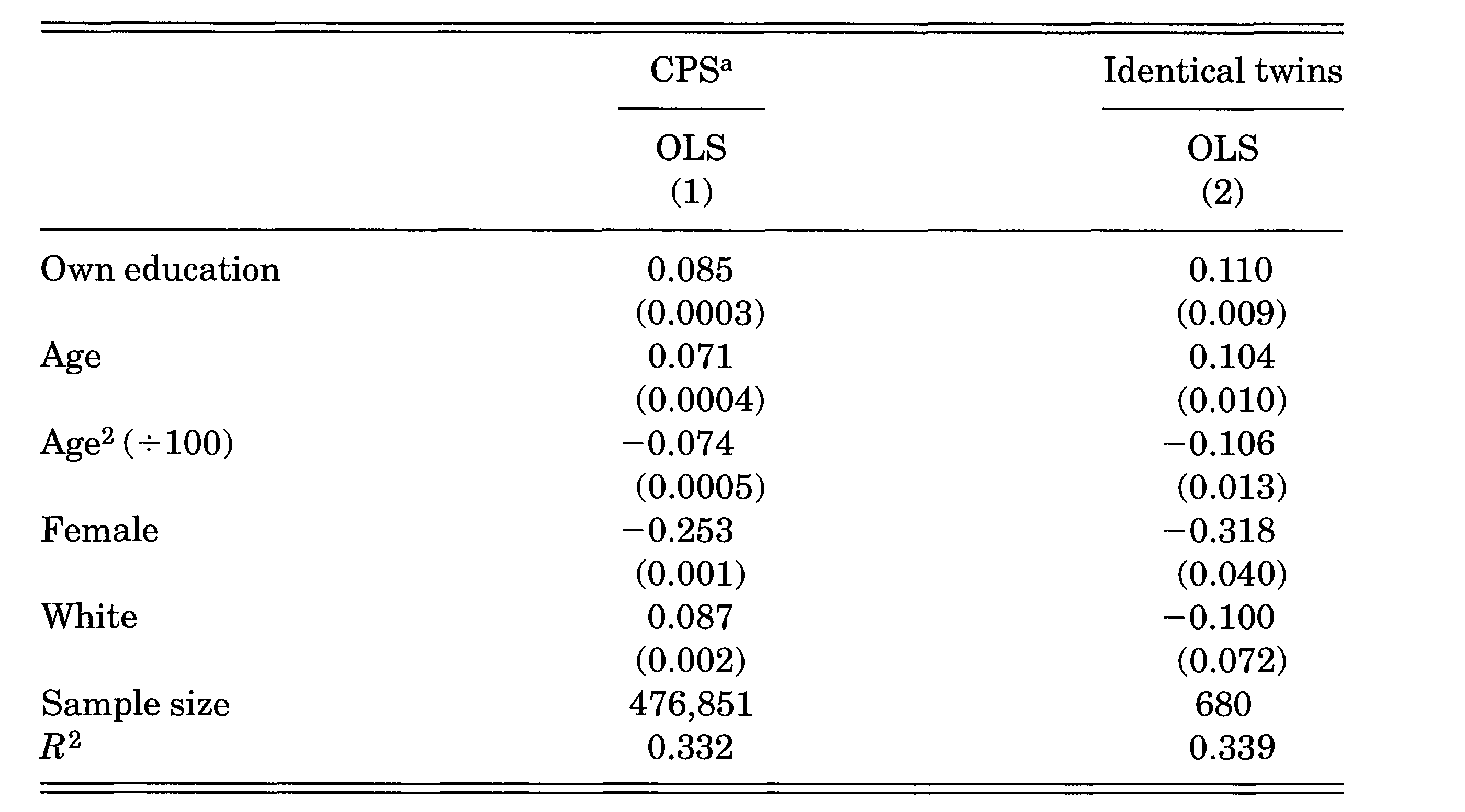 In their framework, ability is mostly explained by genetics, thus to control for it, the authors use a sample of identical twins, to “absorb” unobserved genetics using FE.