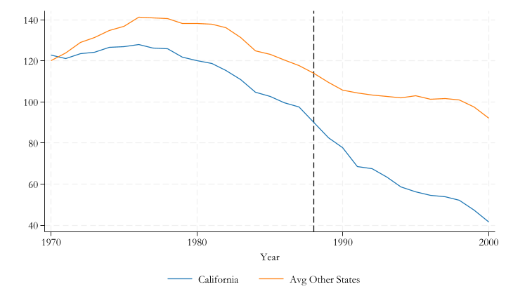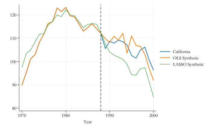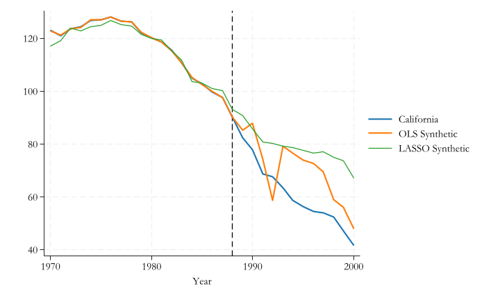 legend(order(1 "California" 2 "OLS Synthetic" 3 "LASSO Synthetic")) xline(1988)(option xb assumed; fitted values)