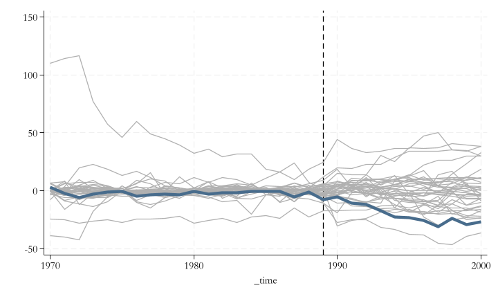 synth cigsale cigsale(1970) cigsale(1975) cigsale(1980) cigsale(1985) cigsale(1988), trunit(3) trperiod(1989) keep(`sc3') replace