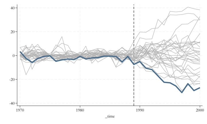 Excluding the treated unit, estimate the pseudo effect of every other unit in the dataset. These are placebos, and you should expect the effect to be zero for them…but you may see some positive and negative effects.