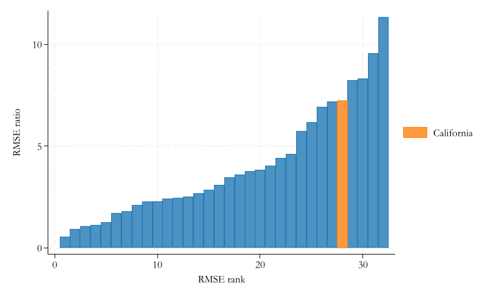 Estimate the ratio between Pre and Post RMSPE, and rank them. \[Ratio_i = \frac{RMSPE_i^{post}}{RMSPE_i^{pre}} \]