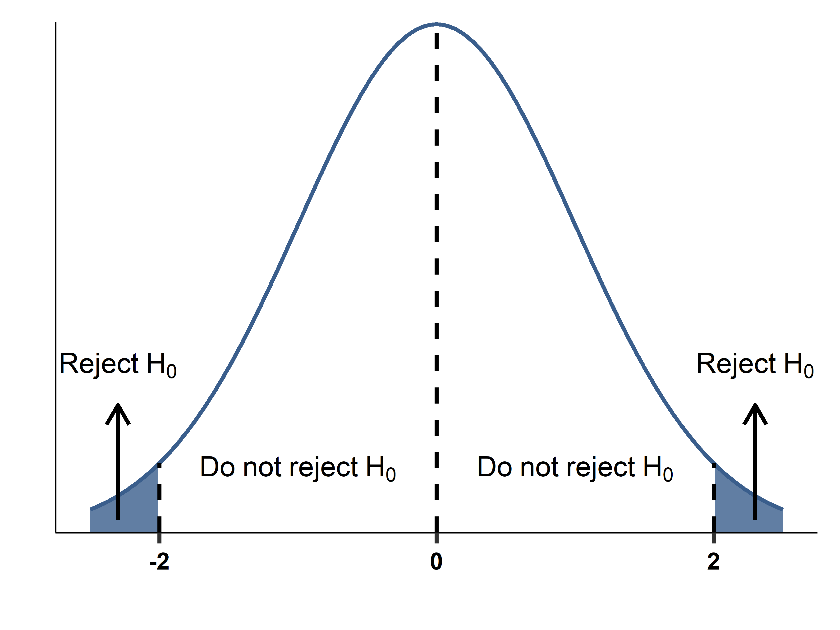 A commonly applied critical value for a t-statistic is ±2 (or 1.96), a 95% confidence level, or a 5% level of significance (alpha).