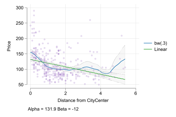- \(\alpha\) is : average \(y\) when \(\ln(x)\) is zero (and thus \(x\) is one), not very meaningful.