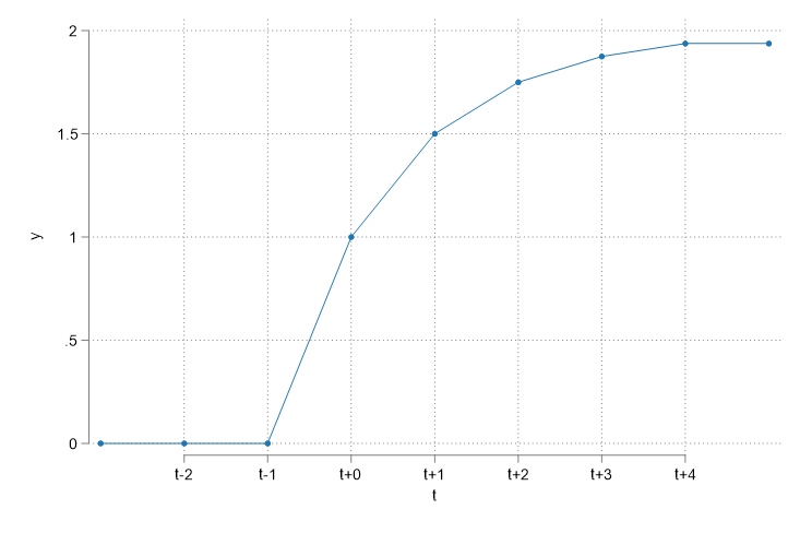 \[\begin{aligned} y_t &= a_0 + \gamma z_t + \gamma \rho z_{t-1} + \dots + e_t \\ y_{t-1} &= a_0 + \gamma z_{t-1} + \gamma \rho z_{t-2} + \dots + e_{t-1} \end{aligned} \]