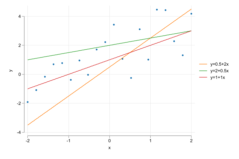 legend(order(2 "y=0.5+2x" 3 "y=2+0.5x" 4 "y=1+1x"))