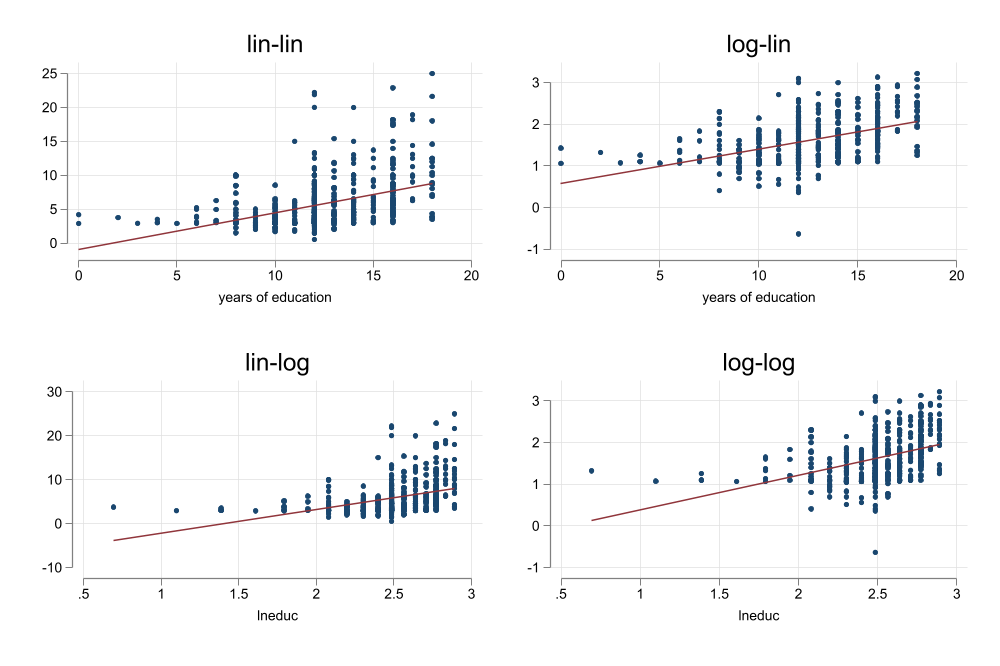 \[ \begin{aligned} log(y) &= \beta_0 + \beta_1 x + e \rightarrow & 100\beta_1 \simeq \frac{\% \Delta y}{\Delta x} \\ y &= \beta_0 + \beta_1 log(x) + e \rightarrow & \frac {\beta_1}{100} \simeq \frac{\Delta y}{\% \Delta x} \\ log(y) &= \beta_0 + \beta_1 log(x) + e \rightarrow & \beta_1 =\frac{\% \Delta y}{\% \Delta x} \end{aligned} \]