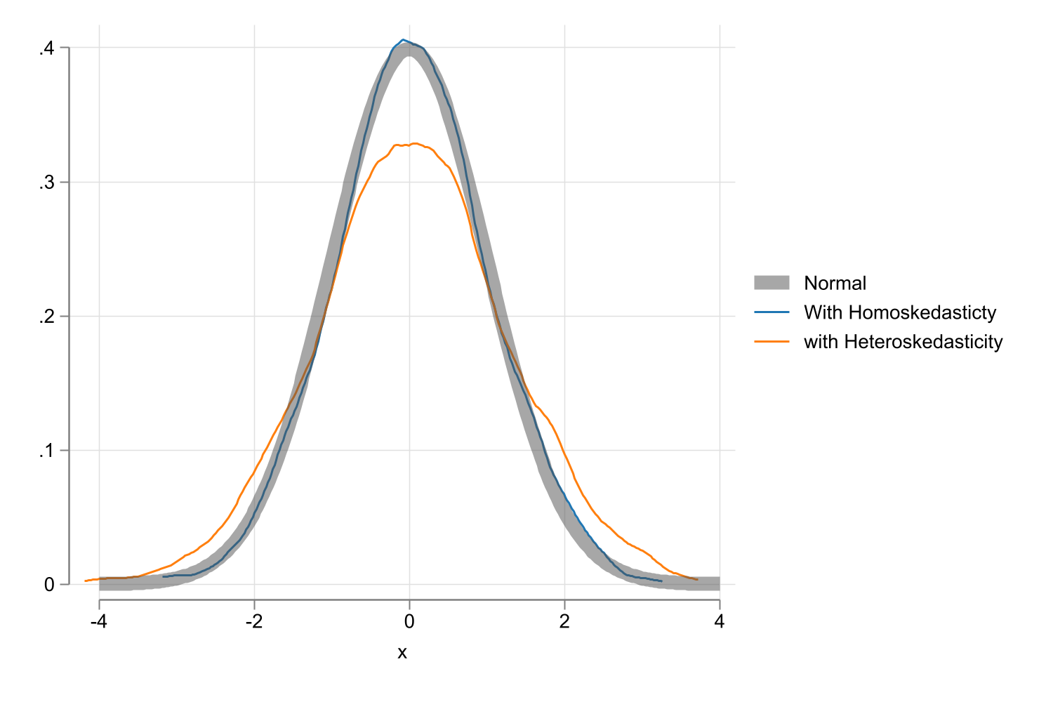 legend(order(3 "Normal" 1 "With Homoskedasticty" 2 "with Heteroskedasticity"))
